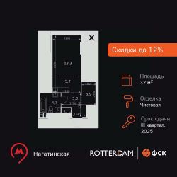 Продаётся квартира-студия номер 451 общей площадью 32.6 кв.м. на 9-м этаже 29 этажного здания. Чистовая отделка. Цена с учётом скидки.