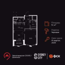 Продаётся 1-к квартира номер 289 общей площадью 51.3 кв.м. на 25-м этаже 26 этажного дома. Отделка Whitebox. Цена с учётом скидки!