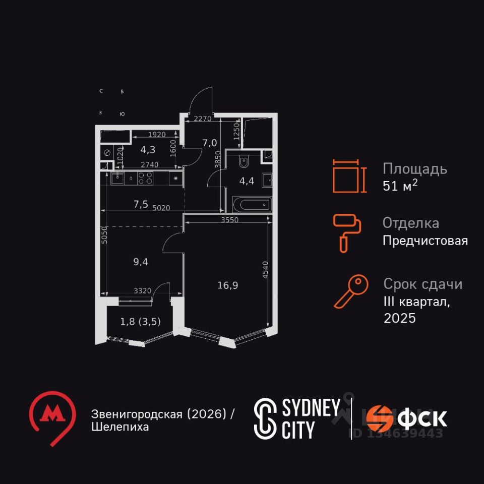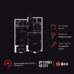 Продаётся 1-к квартира номер 289 общей площадью 51.3 кв.м. на 25-м этаже 26 этажного здания. Отделка Whitebox. Цена с учётом скидки.