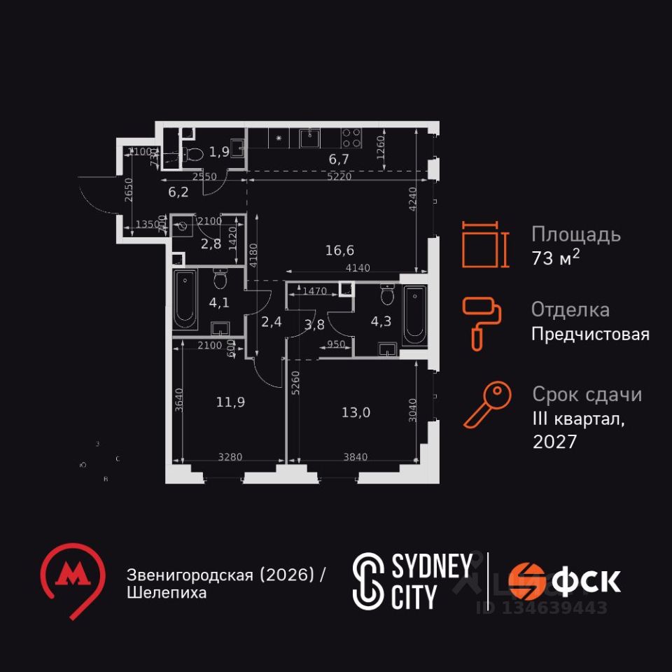 Продаётся 3-к квартира номер 538 общей площадью 73.7 кв.м. на 9-м этаже 42 этажного здания. Отделка Whitebox. Цена с учётом скидки.