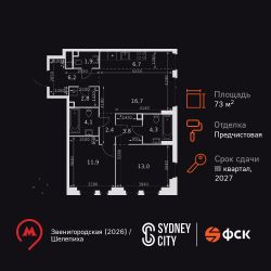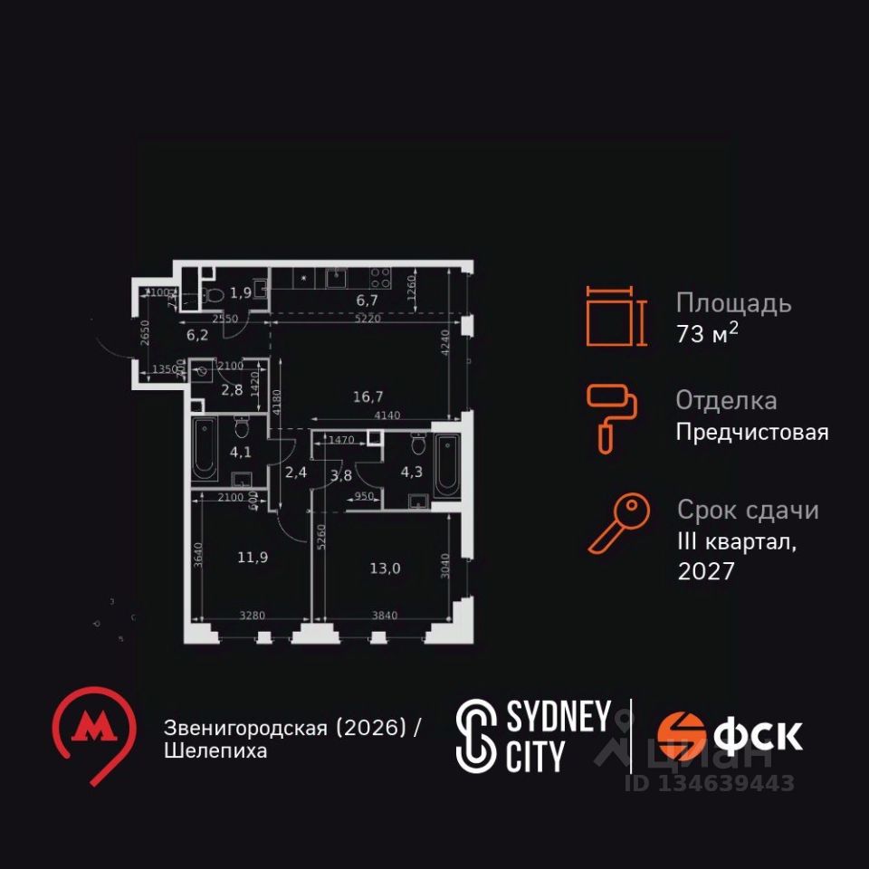 Продаётся 3-к квартира номер 562 общей площадью 73.8 кв.м. на 11-м этаже 42 этажного здания. Отделка Whitebox. Цена с учётом скидки.