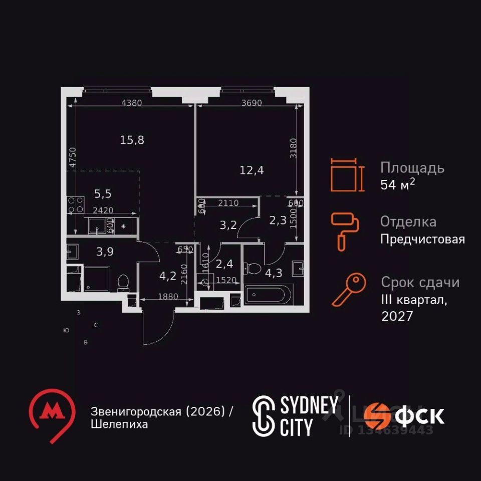 Продаётся 2-к квартира номер 582 общей площадью 54 кв.м. на 12-м этаже 42 этажного здания. Отделка Whitebox. Цена с учётом скидки.