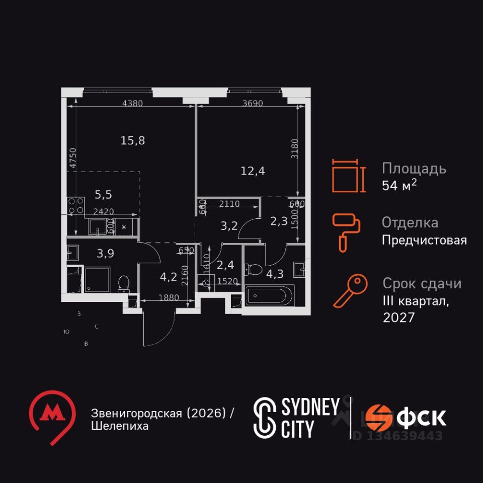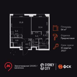 Продаётся 2-к квартира номер 618 общей площадью 54 кв.м. на 15-м этаже 42 этажного здания. Отделка Whitebox. Цена с учётом скидки.