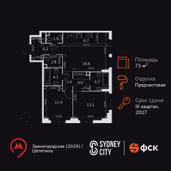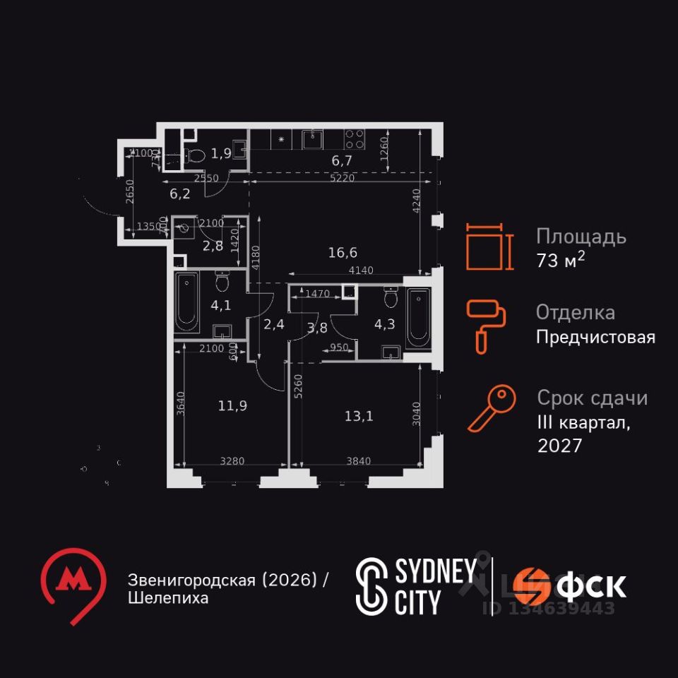 Продаётся 3-к квартира номер 622 общей площадью 73.8 кв.м. на 16-м этаже 42 этажного здания. Отделка Whitebox. Цена с учётом скидки.