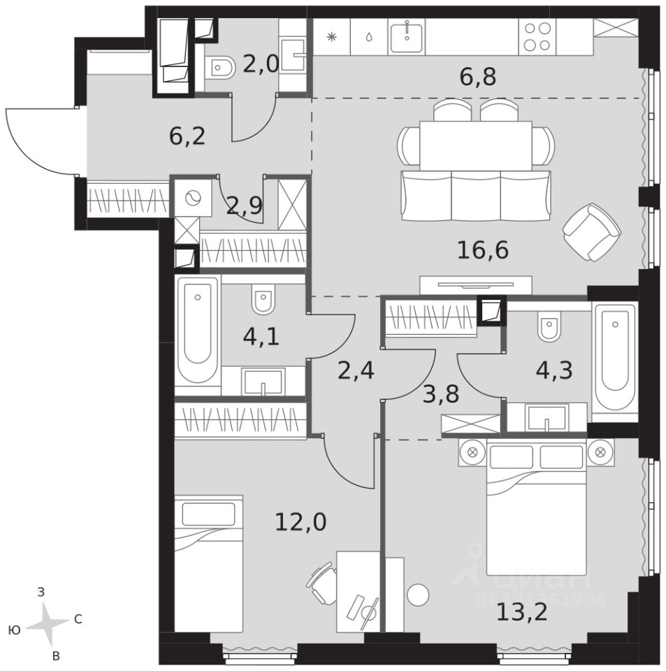 - Мастер-зона с санузлом и гардеробной. Всё для вашего комфорта и удобства, включая личный санузел и гардероб.
