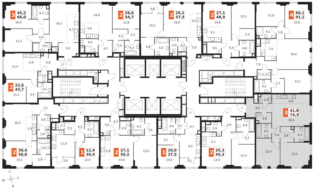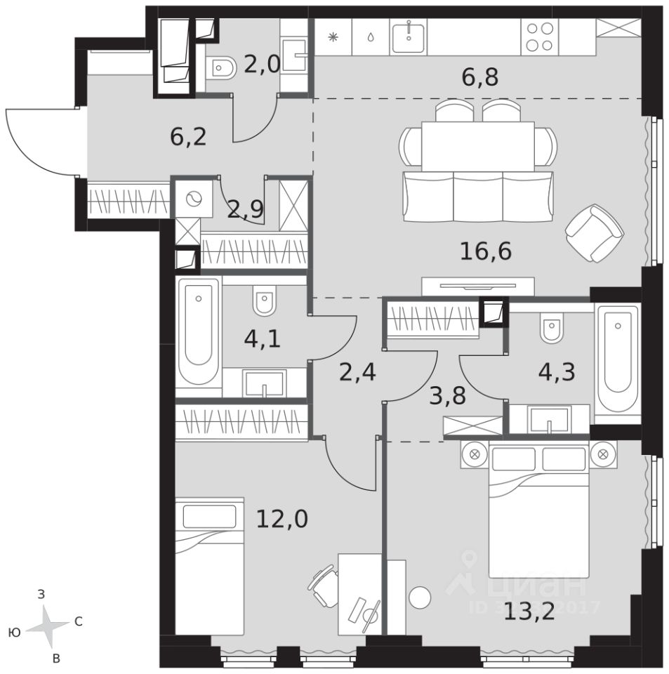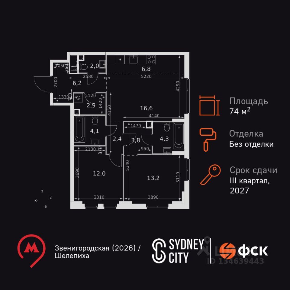 Продаётся 3-к квартира номер 694 общей площадью 74.3 кв.м. на 22-м этаже 42 этажного здания. Без отделки. Цена с учётом скидки.