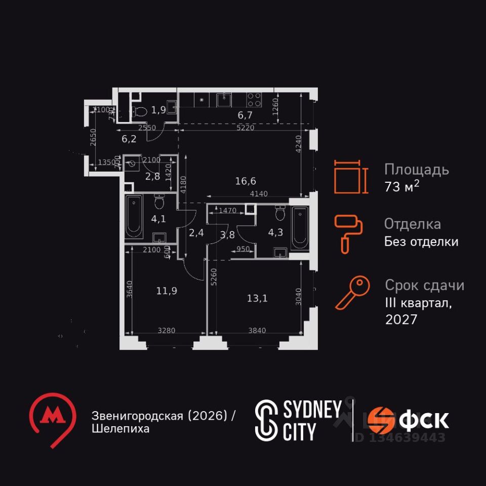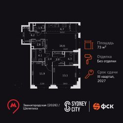 Продаётся 3-к квартира номер 466 общей площадью 73.8 кв.м. на 3-м этаже 42 этажного здания. Без отделки. Цена с учётом скидки.