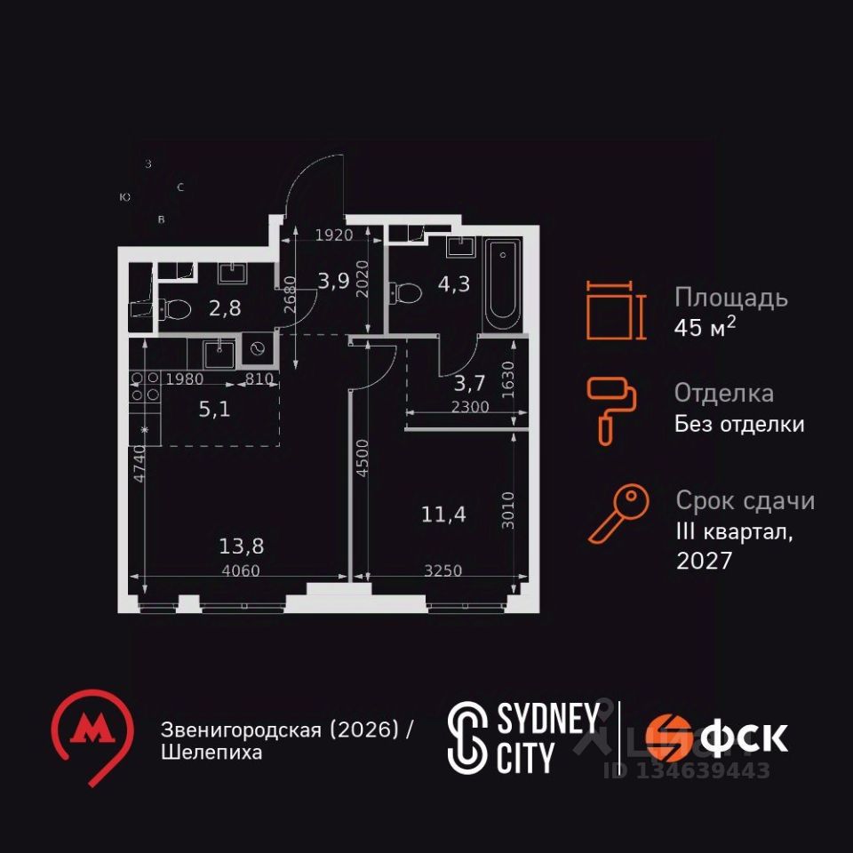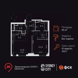 Продаётся 2-к квартира номер 479 общей площадью 45 кв.м. на 4-м этаже 42 этажного здания. Без отделки. Цена с учётом скидки.