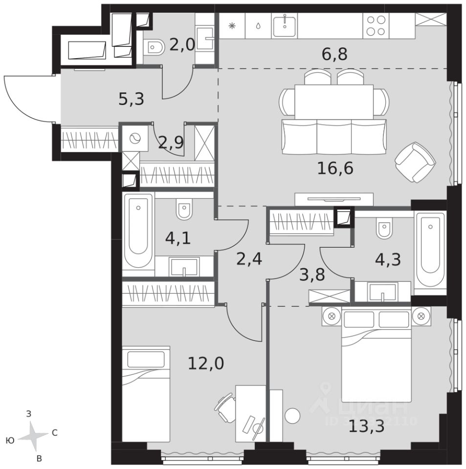 - Мастер-зона с санузлом и гардеробной. Всё для вашего комфорта и удобства, включая личный санузел и гардероб.