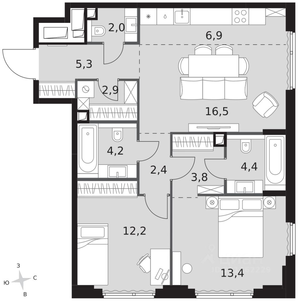 - Мастер-зона с санузлом и гардеробной. Всё для вашего комфорта и удобства, включая личный санузел и гардероб.