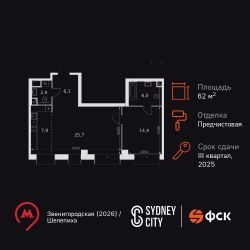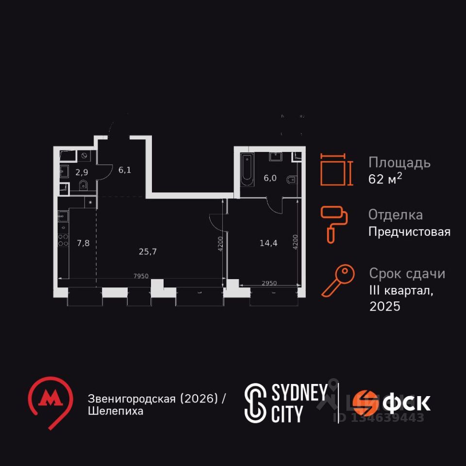Продаётся 2-к квартира номер 431 общей площадью 62.9 кв.м. на 15-м этаже 43 этажного здания. Отделка Whitebox. Цена с учётом скидки.