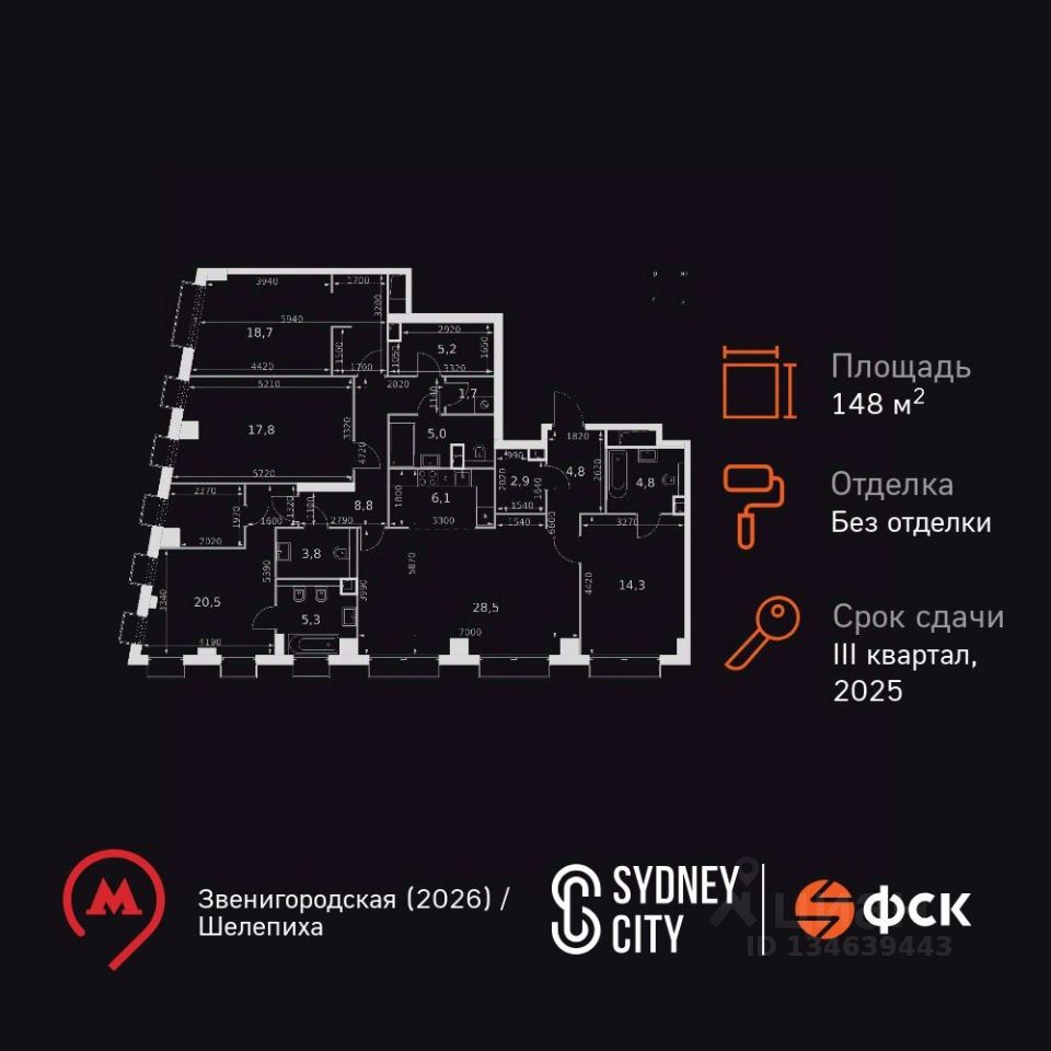 Продаётся 5-к квартира номер 620 общей площадью 148.2 кв.м. на 35-м этаже 43 этажного дома. Без отделки. Цена с учётом скидки!