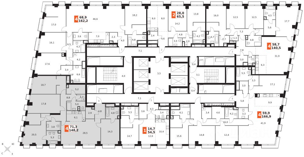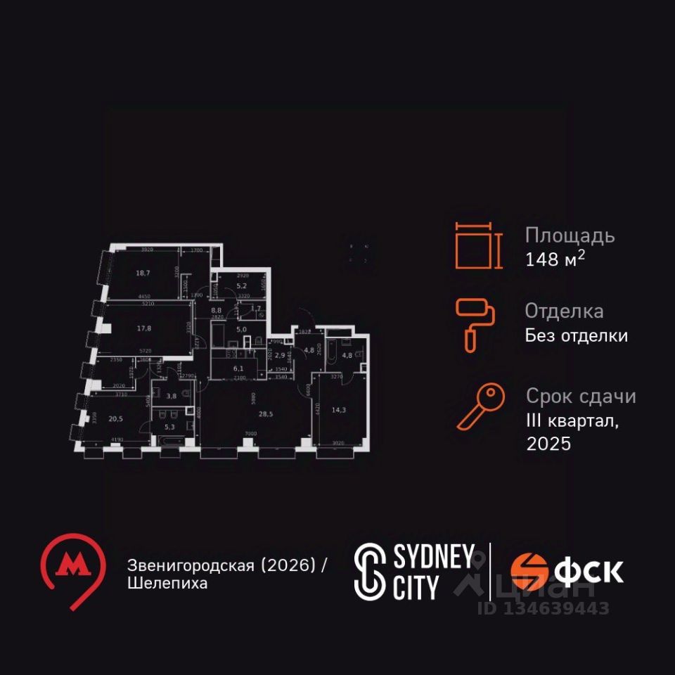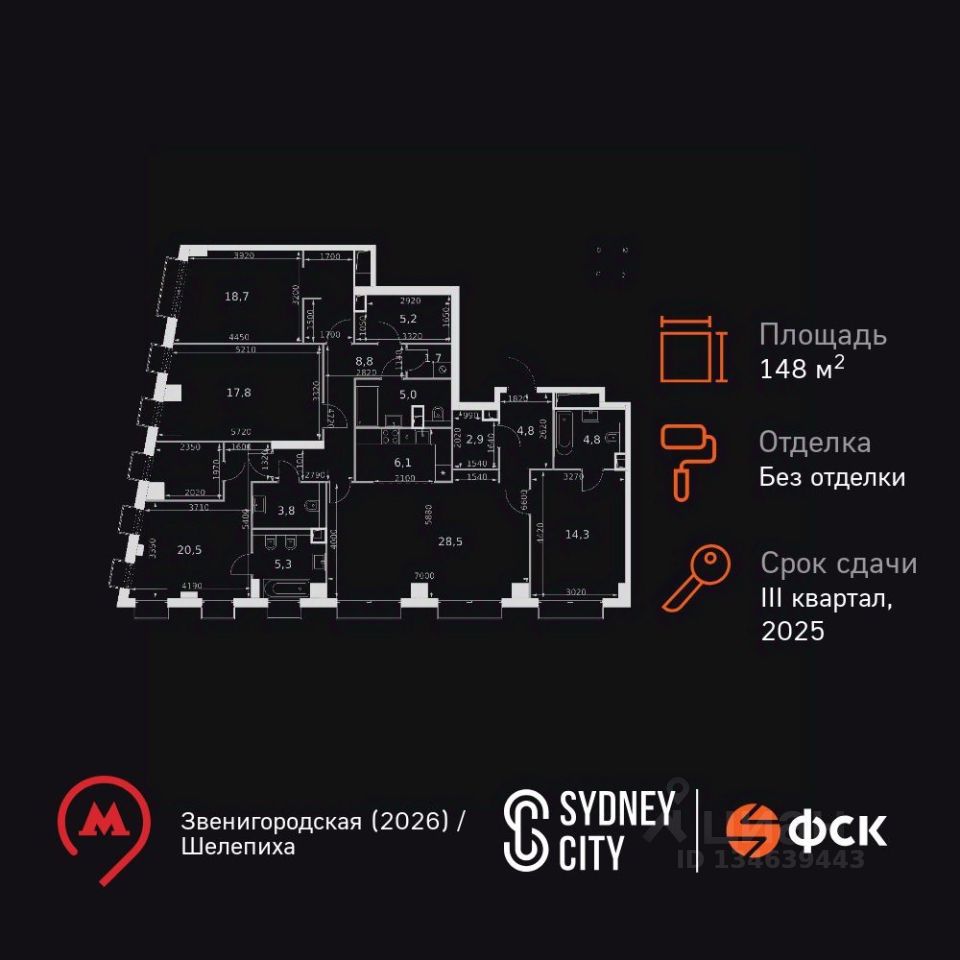 Продаётся 5-к квартира номер 680 общей площадью 148.2 кв.м. на 43-м этаже 43 этажного здания. Без отделки. Цена с учётом скидки.