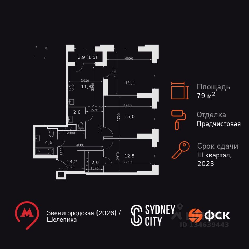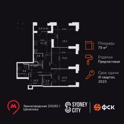 Продаётся 3-к квартира номер 13 общей площадью 79.7 кв.м. на 3-м этаже 43 этажного здания. Отделка Whitebox. Цена с учётом скидки.