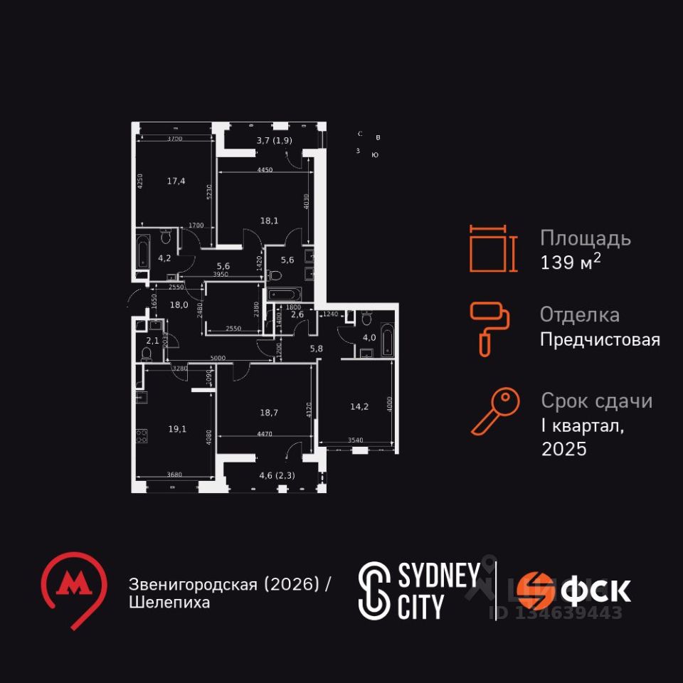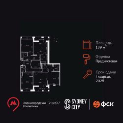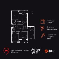Продаётся 4-к квартира номер 238 общей площадью 139.2 кв.м. на 19-м этаже 20 этажного здания. Отделка Whitebox. Цена с учётом скидки.