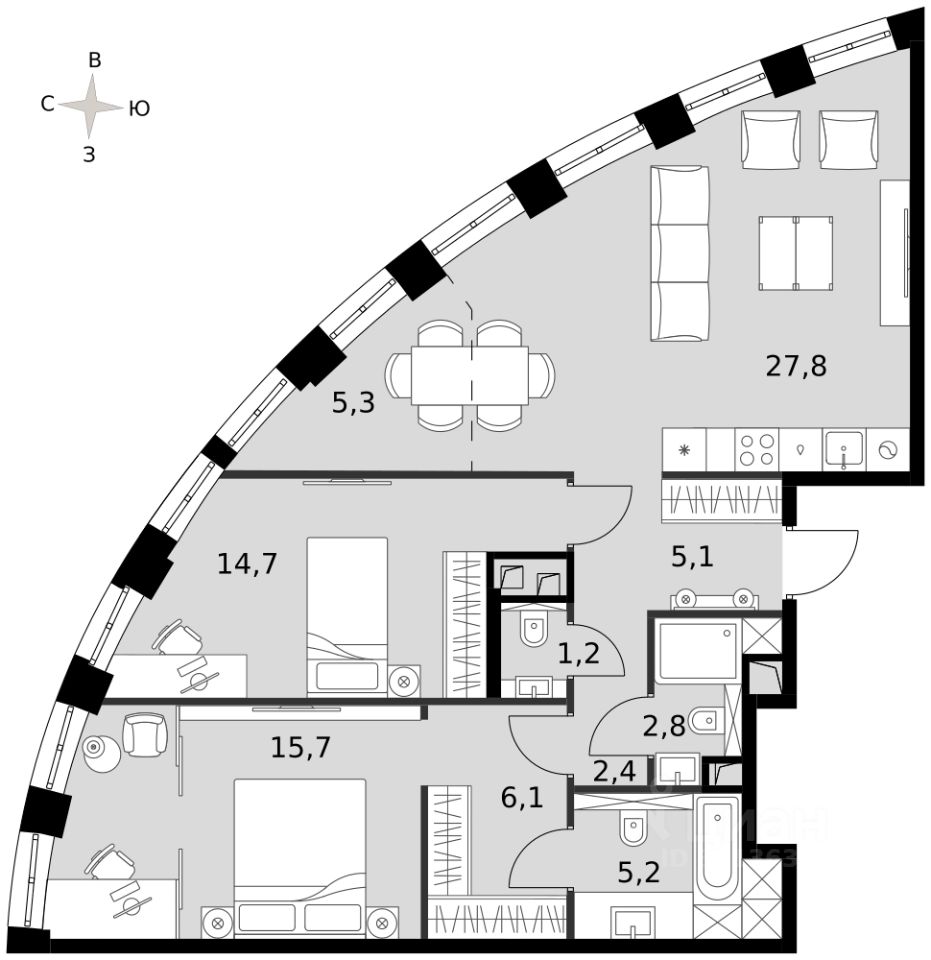 - Мастер-зона с санузлом и гардеробной. Всё для вашего комфорта и удобства, включая личный санузел и гардероб.