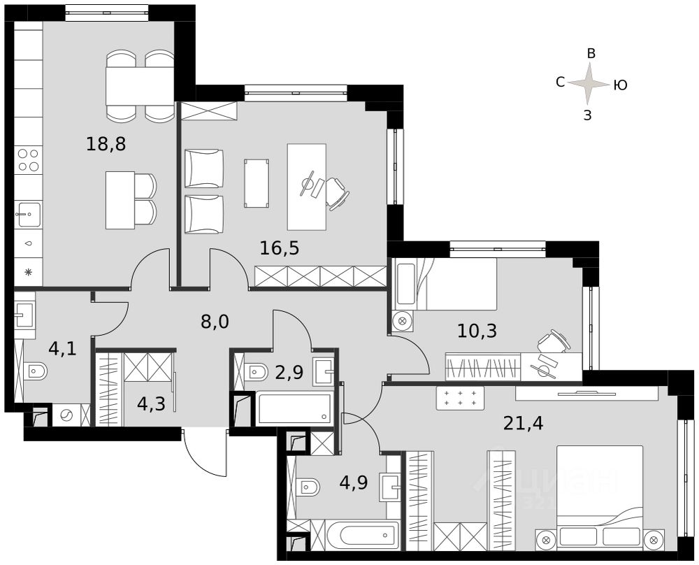 - Просторная кухня - место для семейных ужинов и кулинарных экспериментов.