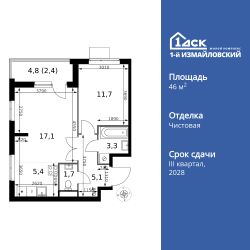 Продаётся 2-к квартира номер 14 общей площадью 46.7 кв.м. на 3-м этаже 24 этажного здания. Чистовая отделка. Цена с учётом скидки.