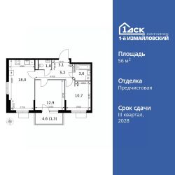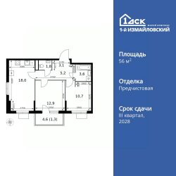 Продаётся 2-к квартира номер 111 общей площадью 56.6 кв.м. на 17-м этаже 24 этажного здания. Отделка Whitebox. Цена с учётом скидки.