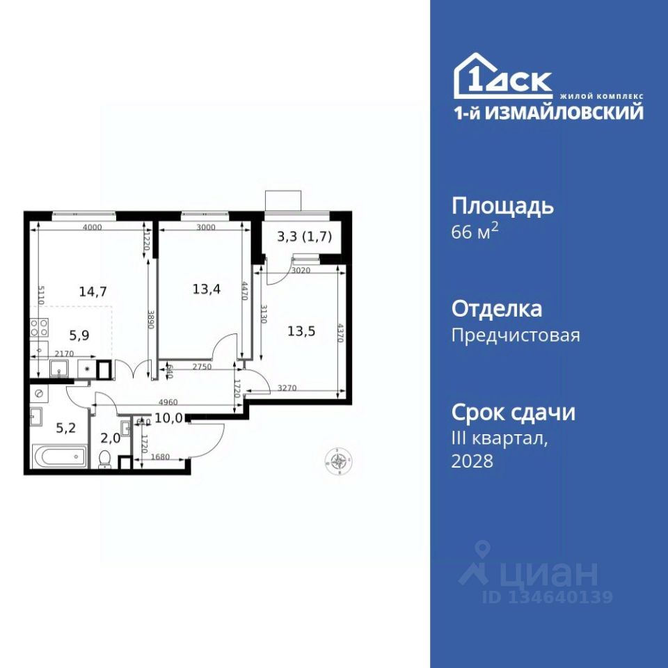Продаётся 3-к квартира номер 253 общей площадью 66.4 кв.м. на 13-м этаже 25 этажного здания. Отделка Whitebox. Цена с учётом скидки.