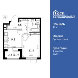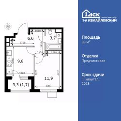 Продаётся 1-к квартира номер 399 общей площадью 33.7 кв.м. на 8-м этаже 10 этажного здания. Отделка Whitebox. Цена с учётом скидки.