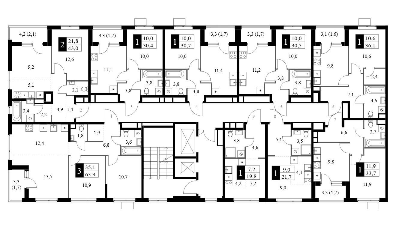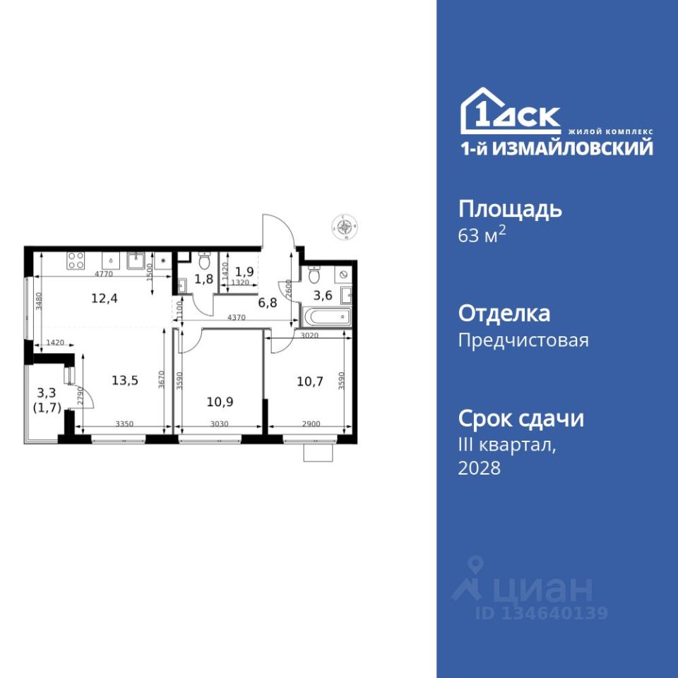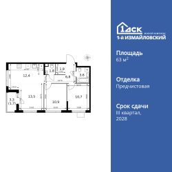 Продаётся 3-к квартира номер 402 общей площадью 63.3 кв.м. на 9-м этаже 10 этажного здания. Отделка Whitebox. Цена с учётом скидки.