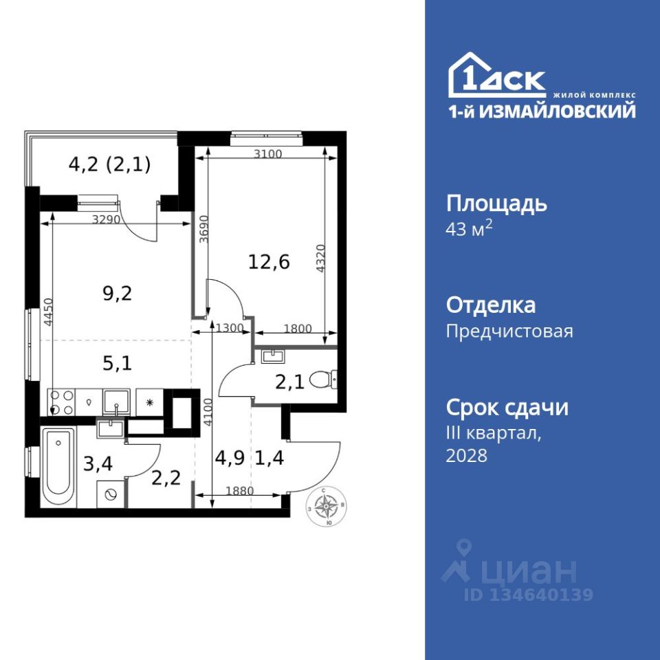 Продаётся 2-к квартира номер 403 общей площадью 43 кв.м. на 9-м этаже 10 этажного здания. Отделка Whitebox. Цена с учётом скидки.