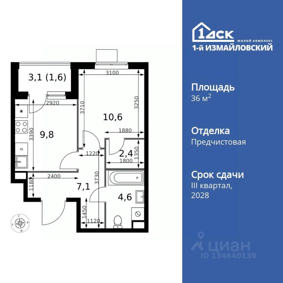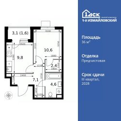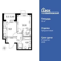 Продаётся 1-к квартира номер 407 общей площадью 36.1 кв.м. на 9-м этаже 10 этажного здания. Отделка Whitebox. Цена с учётом скидки.