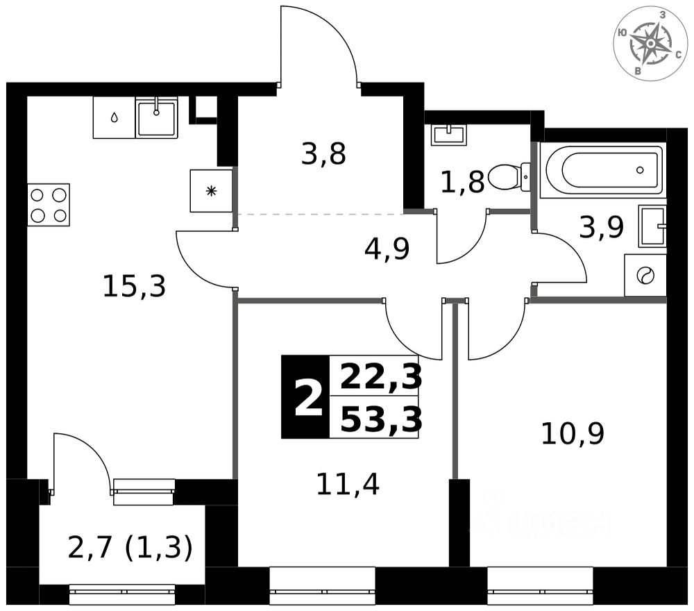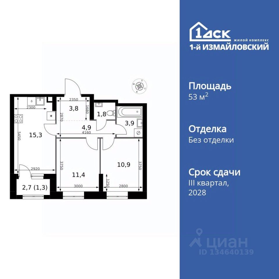 Продаётся 2-к квартира номер 423 общей площадью 53.3 кв.м. на 2-м этаже 32 этажного дома. Без отделки.