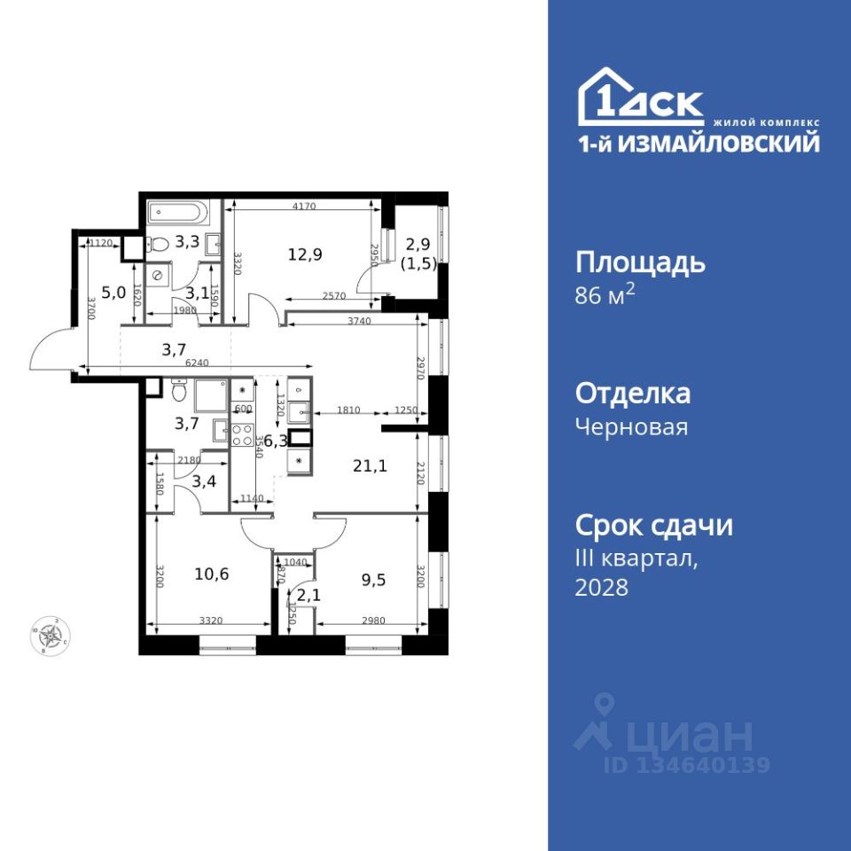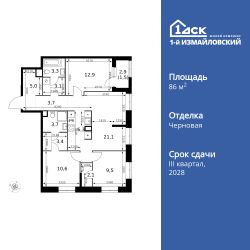 Продаётся 4-к квартира номер 675 общей площадью 86.2 кв.м. на 19-м этаже 32 этажного дома. Отделка Whitebox.
