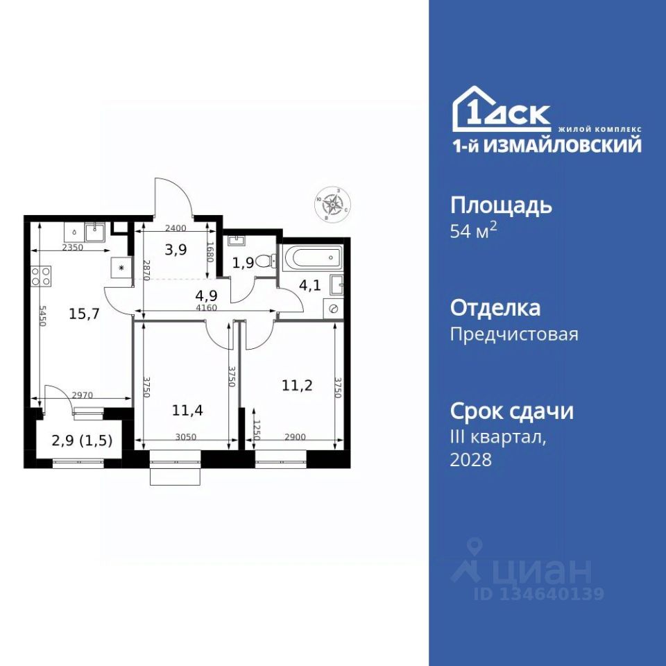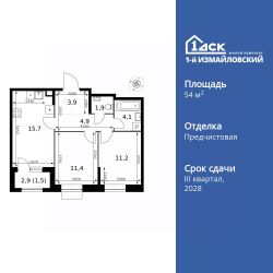 Продаётся 2-к квартира номер 678 общей площадью 54.6 кв.м. на 19-м этаже 32 этажного здания. Отделка Whitebox.