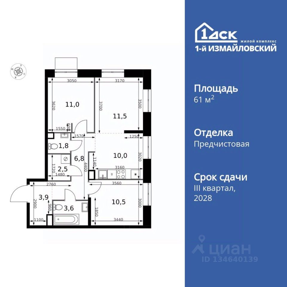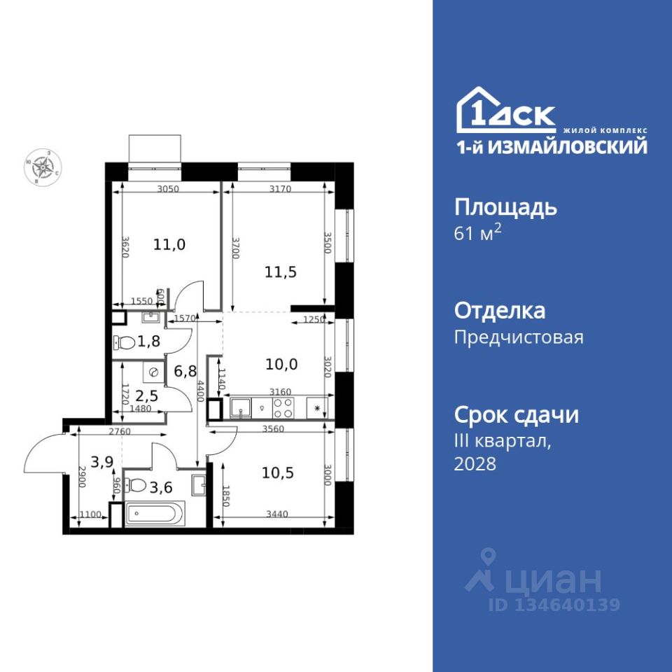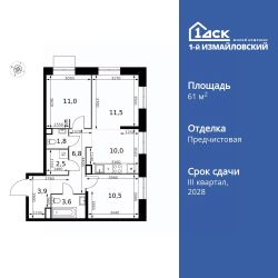 Продаётся 3-к квартира номер 704 общей площадью 61.6 кв.м. на 20-м этаже 32 этажного здания. Отделка Whitebox.