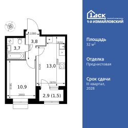 Продаётся 1-к квартира номер 587 общей площадью 32.9 кв.м. на 13-м этаже 32 этажного здания. Отделка Whitebox.