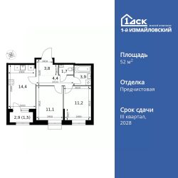 Продаётся 2-к квартира номер 526 общей площадью 52 кв.м. на 9-м этаже 32 этажного здания. Отделка Whitebox.