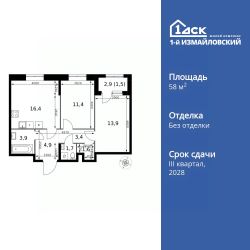 Продаётся 2-к квартира номер 840 общей площадью 58.7 кв.м. на 30-м этаже 32 этажного здания. Без отделки.