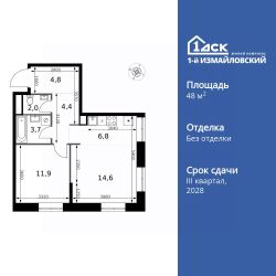 Продаётся 2-к квартира номер 846 общей площадью 48.2 кв.м. на 31-м этаже 32 этажного здания. Без отделки.