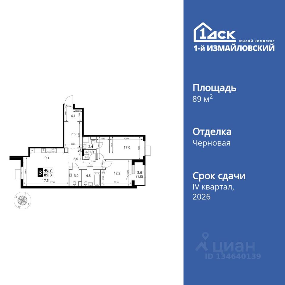 Продаётся 3-к квартира номер 628 общей площадью 89.3 кв.м. на 8-м этаже 15 этажного дома. Отделка Whitebox. Цена с учётом скидки!