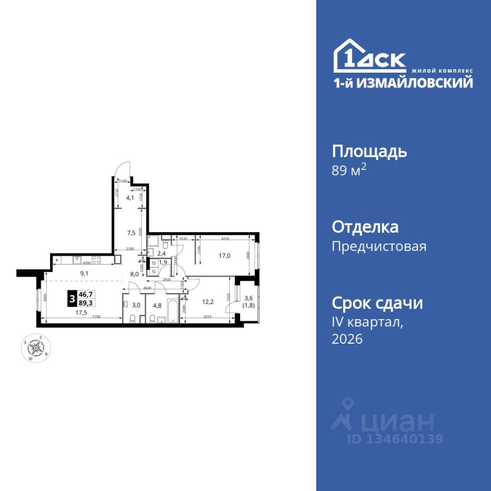 Продаётся 3-к квартира номер 544 общей площадью 89.3 кв.м. на 2-м этаже 15 этажного здания. Отделка Whitebox. Цена с учётом скидки.