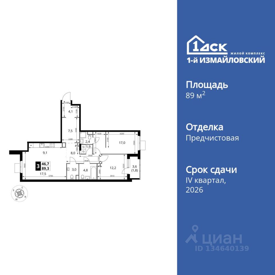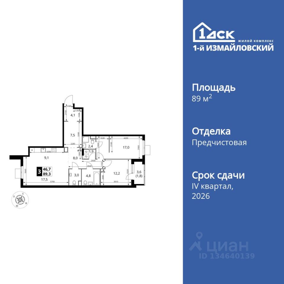 Продаётся 3-к квартира номер 670 общей площадью 89.3 кв.м. на 11-м этаже 15 этажного здания. Отделка Whitebox. Цена с учётом скидки.