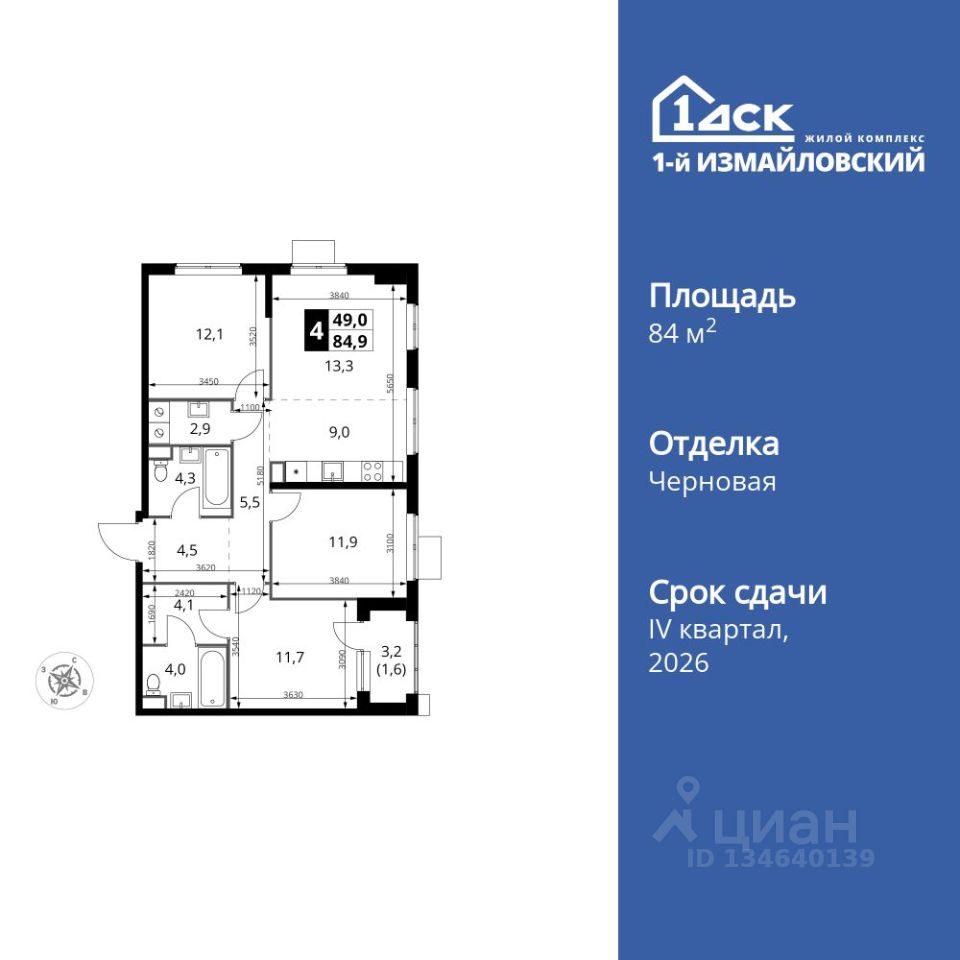 Продаётся 4-к квартира номер 571 общей площадью 84.9 кв.м. на 4-м этаже 15 этажного дома. Отделка Whitebox. Цена с учётом скидки!