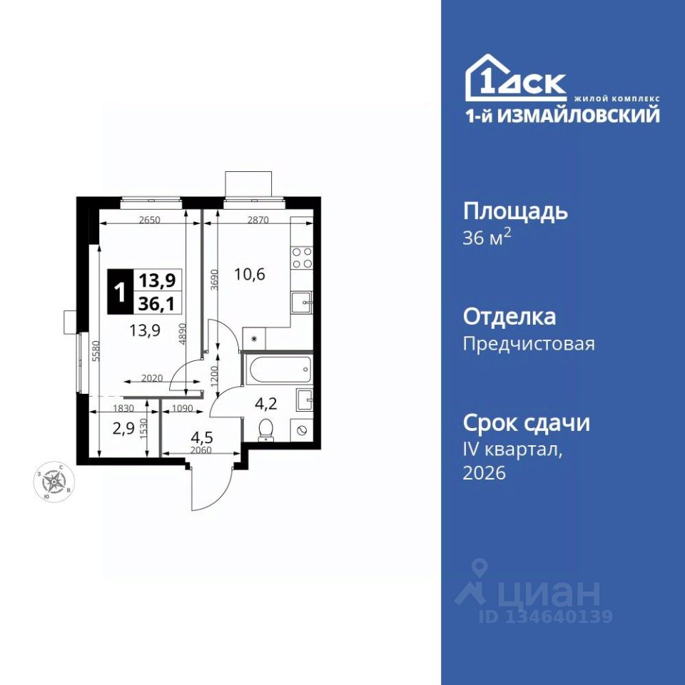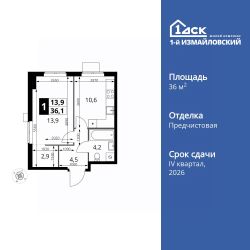 Продаётся 1-к квартира номер 690 общей площадью 36.1 кв.м. на 13-м этаже 15 этажного здания. Отделка Whitebox. Цена с учётом скидки.