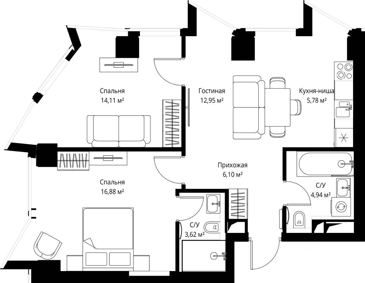 Продаётся 2-комнатная квартира площадью 64.38 м² с предчистовой отделкой на 14-м этаже премиального небоскреба Famous.
