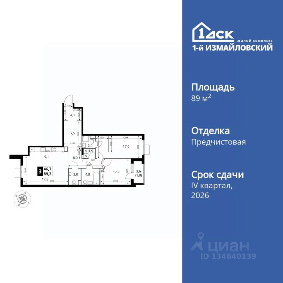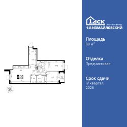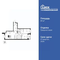 Продаётся 3-к квартира номер 726 общей площадью 89.3 кв.м. на 15-м этаже 15 этажного здания. Отделка Whitebox. Цена с учётом скидки.