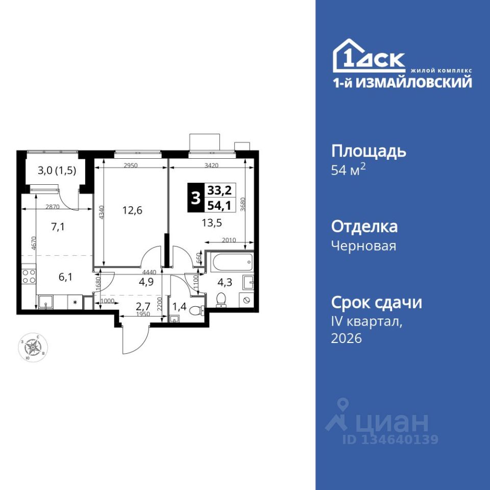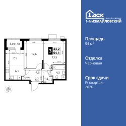 Продаётся 3-к квартира номер 584 общей площадью 54.1 кв.м. на 5-м этаже 15 этажного дома. Отделка Whitebox. Цена с учётом скидки!