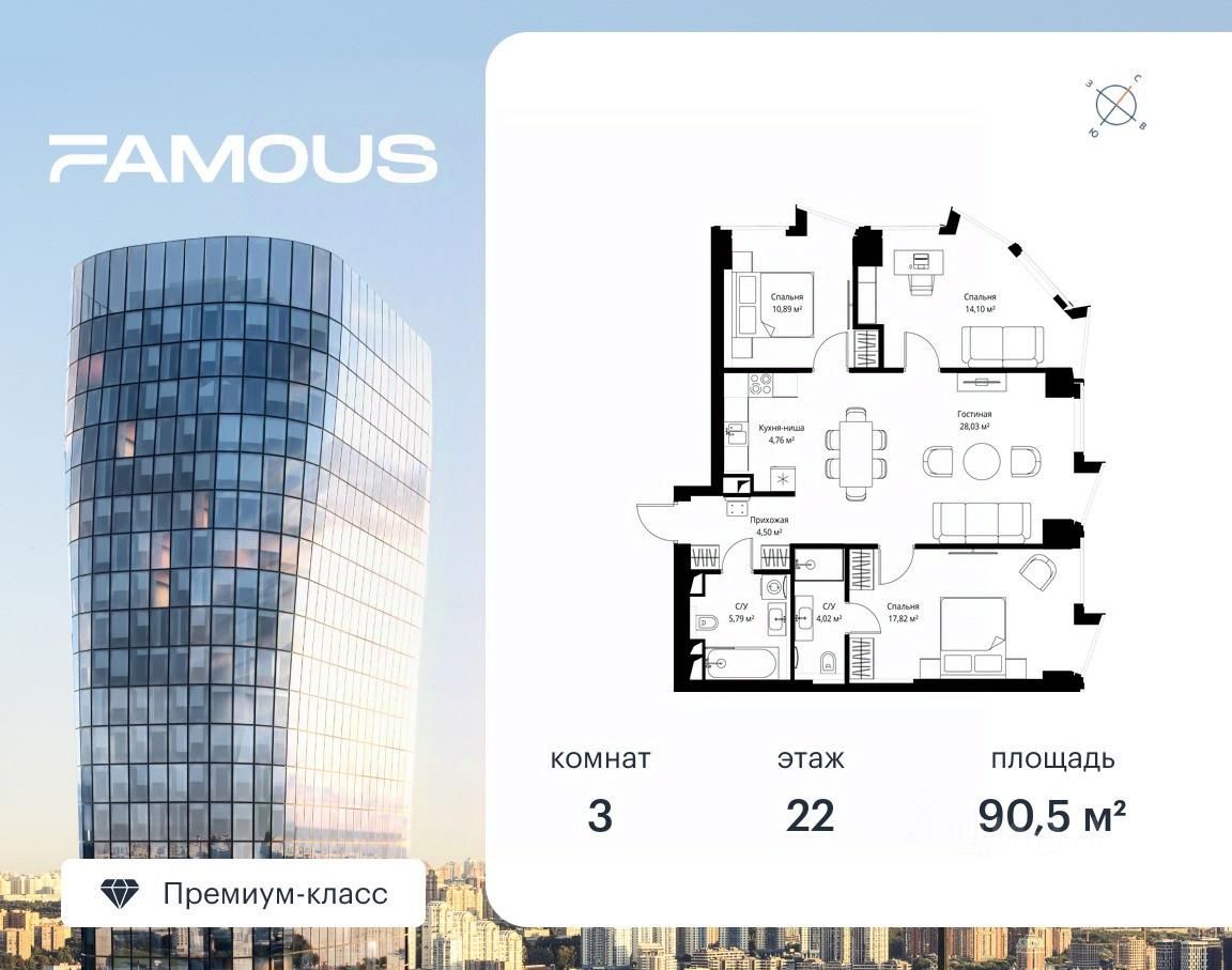 Продаётся 3-комнатная квартира площадью 90.50 м² с предчистовой отделкой на 22-м этаже премиального небоскреба Famous.