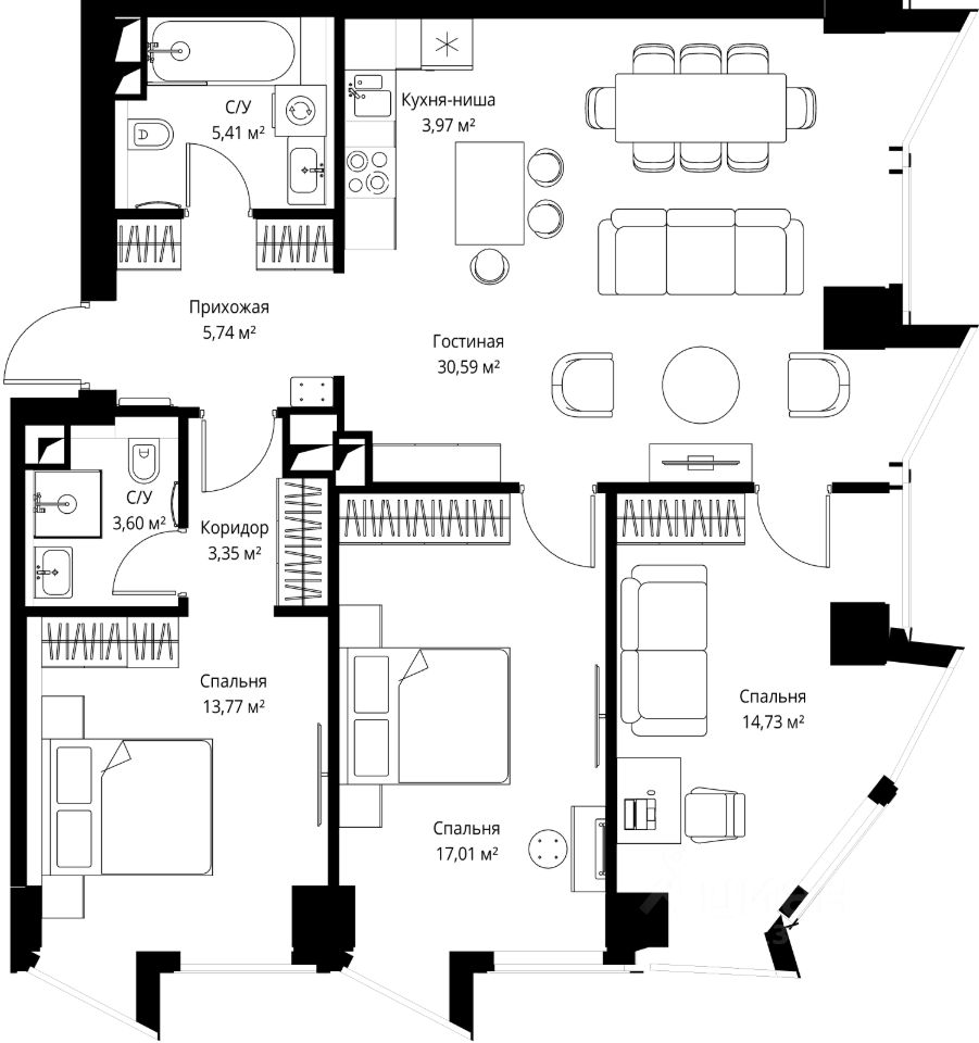 Продаётся 3-комнатная квартира площадью 98.17 м² с предчистовой отделкой на 17-м этаже премиального небоскреба Famous.