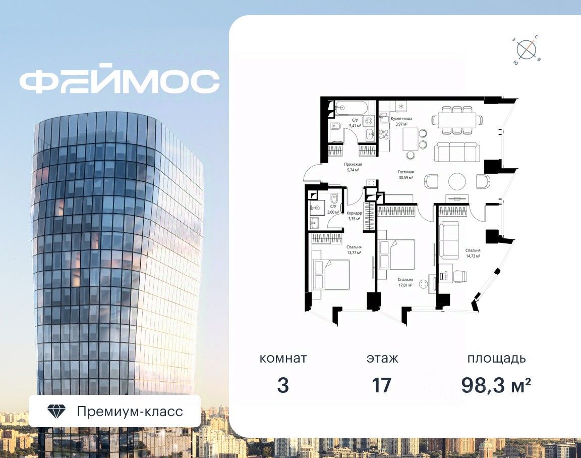 Продаётся 3-комнатная квартира площадью 98.30 м² с предчистовой отделкой на 17-м этаже премиального небоскреба Феймос.