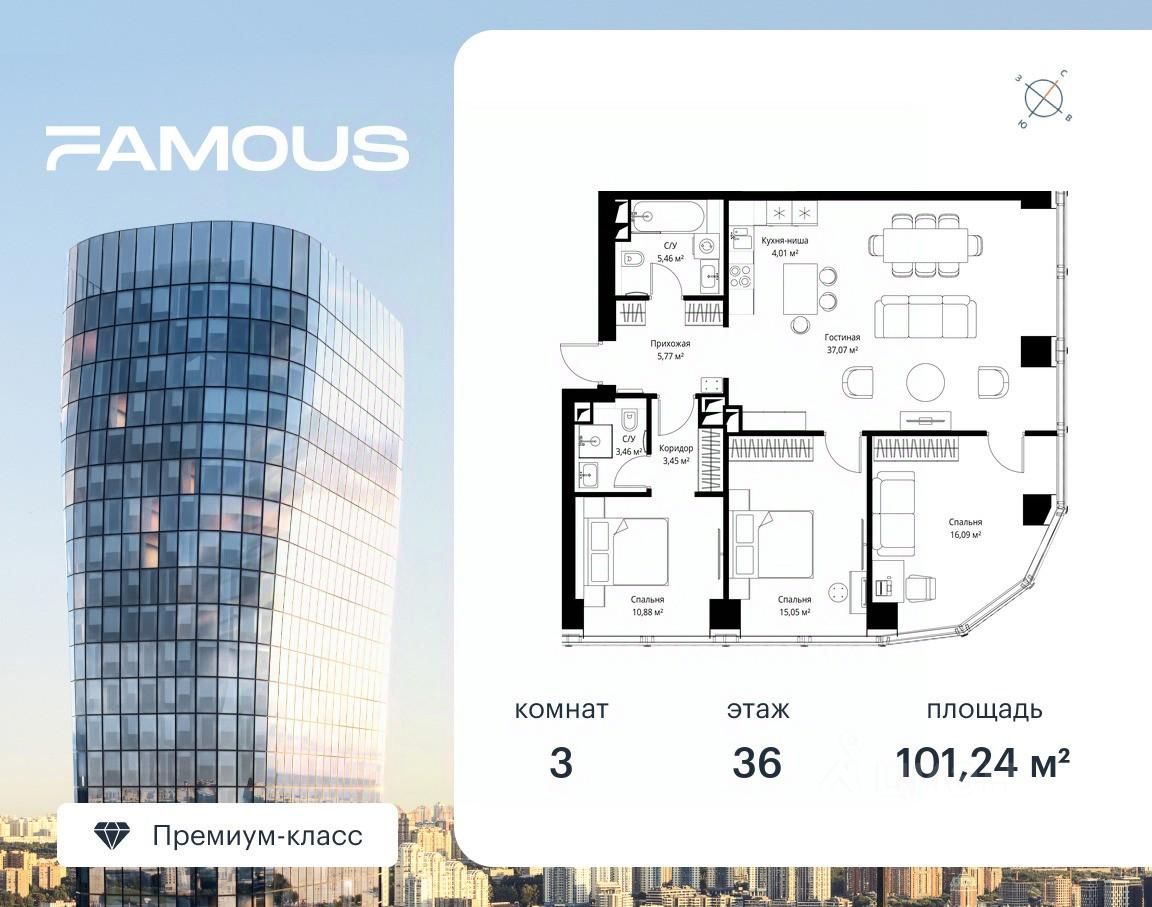 Продаётся 3-комнатная квартира площадью 101.24 м² с предчистовой отделкой на 36-м этаже премиального небоскреба Famous.
