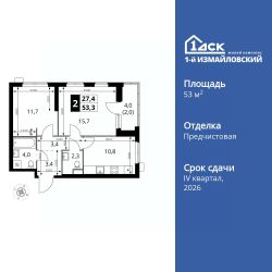 Продаётся 2-к квартира номер 8 общей площадью 53.3 кв.м. на 2-м этаже 25 этажного здания. Отделка Whitebox. Цена с учётом скидки.