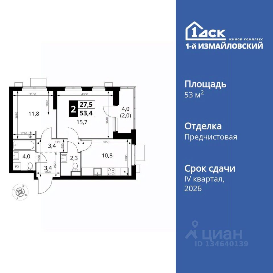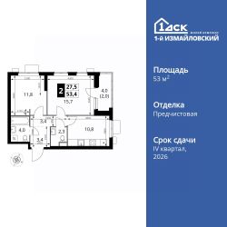 Продаётся 2-к квартира номер 128 общей площадью 53.4 кв.м. на 12-м этаже 25 этажного здания. Отделка Whitebox. Цена с учётом скидки.
